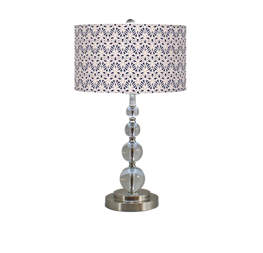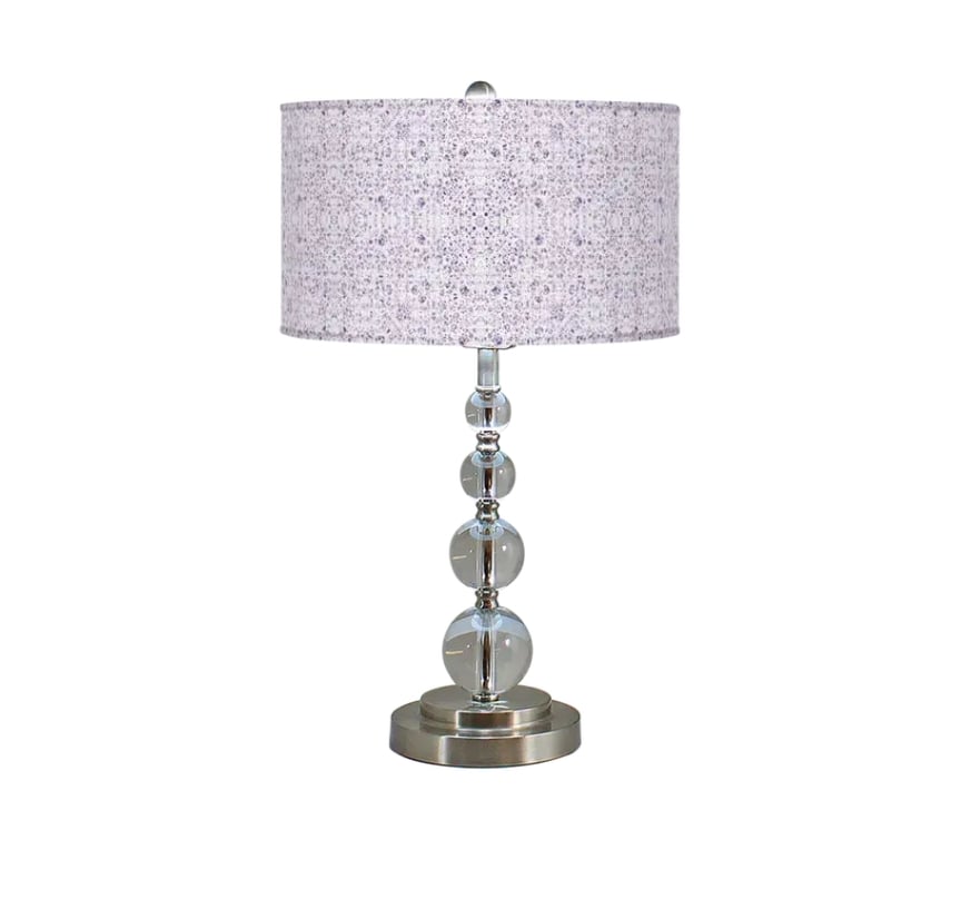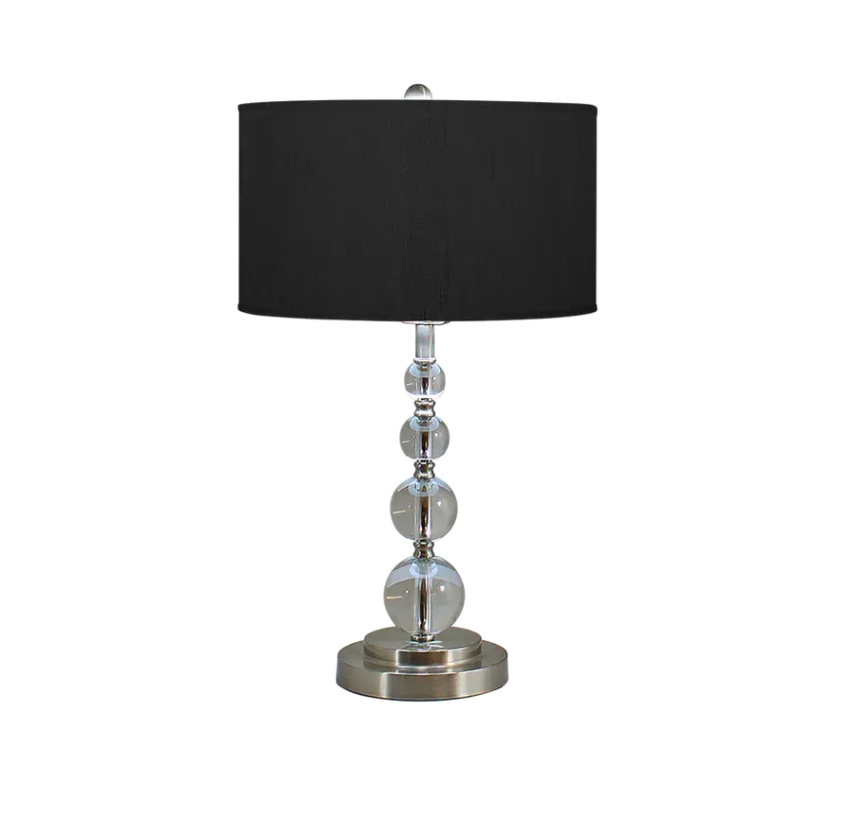 The Savannah Table Lamp offers versatility and style to any room setting with its sophisticated base of stacked glass balls descending in diameter, on a brushed nickel base. A customer favorite, as the design of the shade transforms this ambient lighting to reflect its design aesthetic. Perfect for hospitality and residential use, to complete any bedroom, living room, accent table, hallway entry or buffet table.