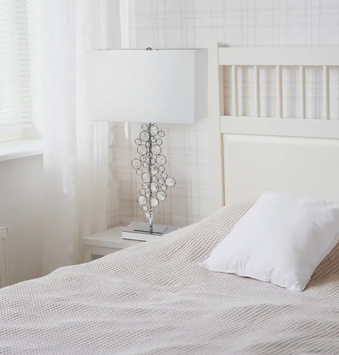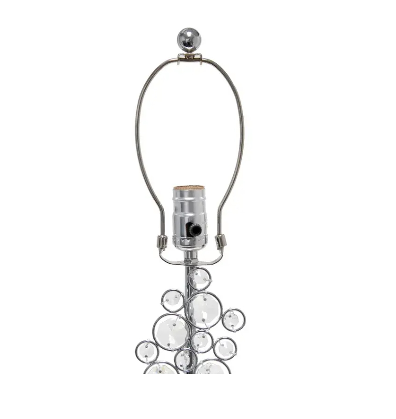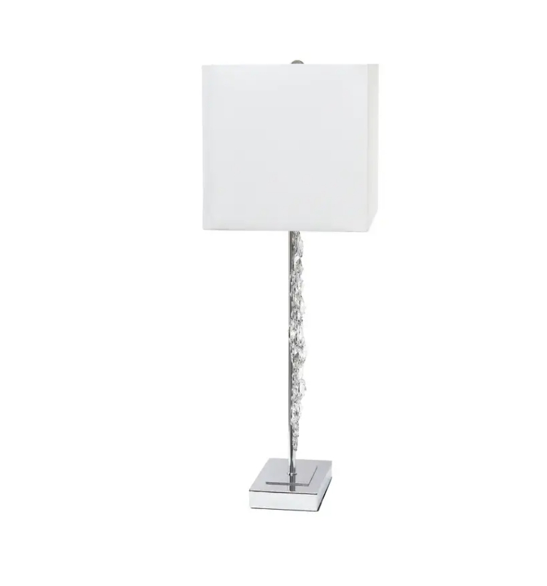 An embellished array of prismatic crystals sits among a chrome stemmed base and is paired with a rectangle shaped white fabric shade. Sitting at 26.25", this sophisticated, creative, and timeless lamp will not only brighten up your space but will satisfy your desire of a compelling piece of decor for the room of your choice.