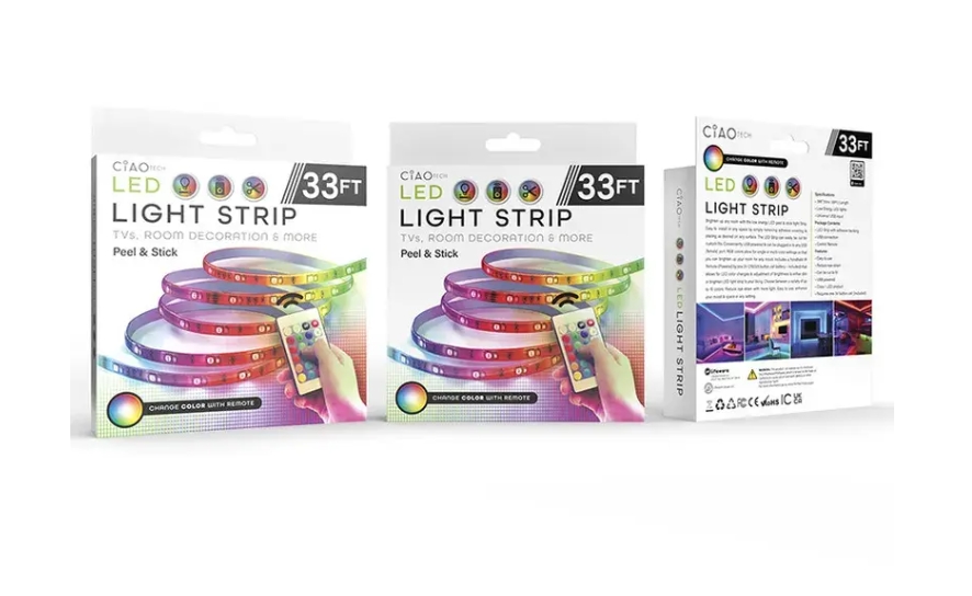 Introducing the Ciao Tech LED RGB 33 Ft Strip Light with Remote - your key to vibrant and personalized lighting. This package includes the LED strip light, USB cable, remote, manual, all neatly packed in an individual package for easy use. Powered by low-energy LED lights, this versatile strip features a universal USB input, making it convenient to use. Customize the length to fit your space, as the strip can be easily cut to size. With user-friendly controls, easy installation, and one (3v) button cell included for added convenience, this LED strip is designed for simplicity and style. Illuminate your surroundings effortlessly with the Ciao Tech LED RGB 33 Ft Strip Light - where versatility meets vibrancy for a personalized and visually stunning lighting experience!