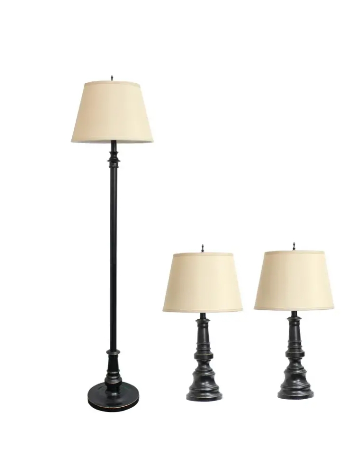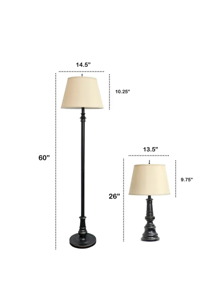 Decorate your home with this beautiful 3 piece matching table and floor lamp set! The restoration bronze detail embraces the curved lines and details throughout the base of each lamp, and is paired with a lovely tan fabric shade to bring you a warm, welcoming ambiance while satisfying your lighting needs. Perfect for a rustic, industrial, or classic style space!