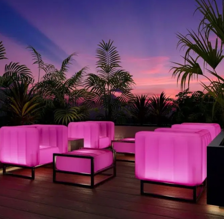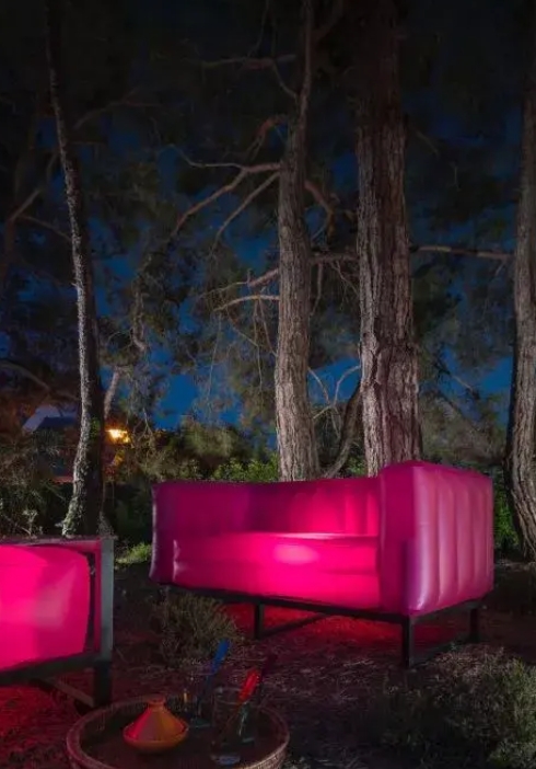 New Yomi sofa with a seat made of an eco-responsible product that reveals a frosted aspect to diffuse the light that has settled on it. Illuminate your evenings by the fire or bring a festive touch to your long evenings on the terrace. Armchair available in orange, green, pink, blue or white frosted look. This indoor but also outdoor furniture is easy to clean and will easily find its place by the pool. It will be perfect on your terrace, as a unique piece of furniture, it will enhance your garden furniture. Assemble the Mojow outdoor armchairs and sofas to create your own modern, elegant and original design garden furniture.