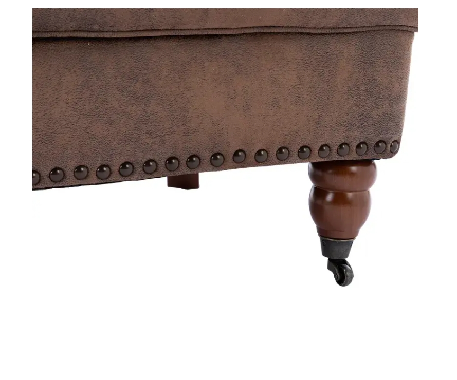 ? DURABLE FRAME: Kiln dried hardwood frame is used to prevent warping for years of reliable seating, and wrapped in durable polyester upholstery in Worn- in fabric with sturdy espresso finished wood legs.