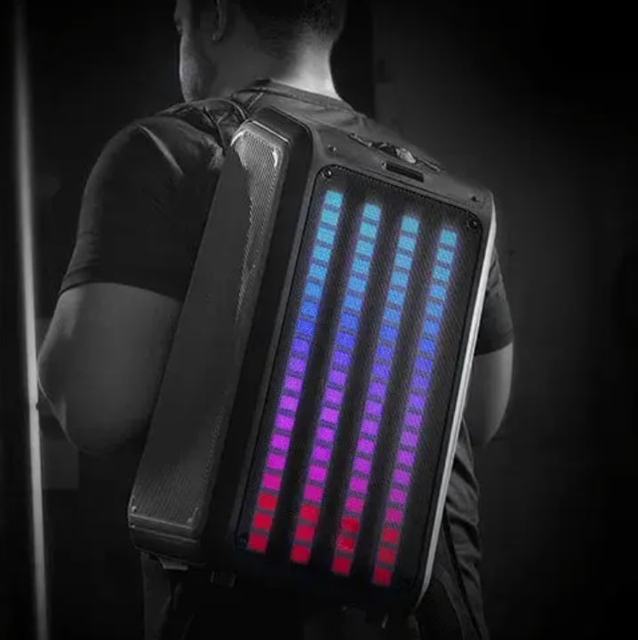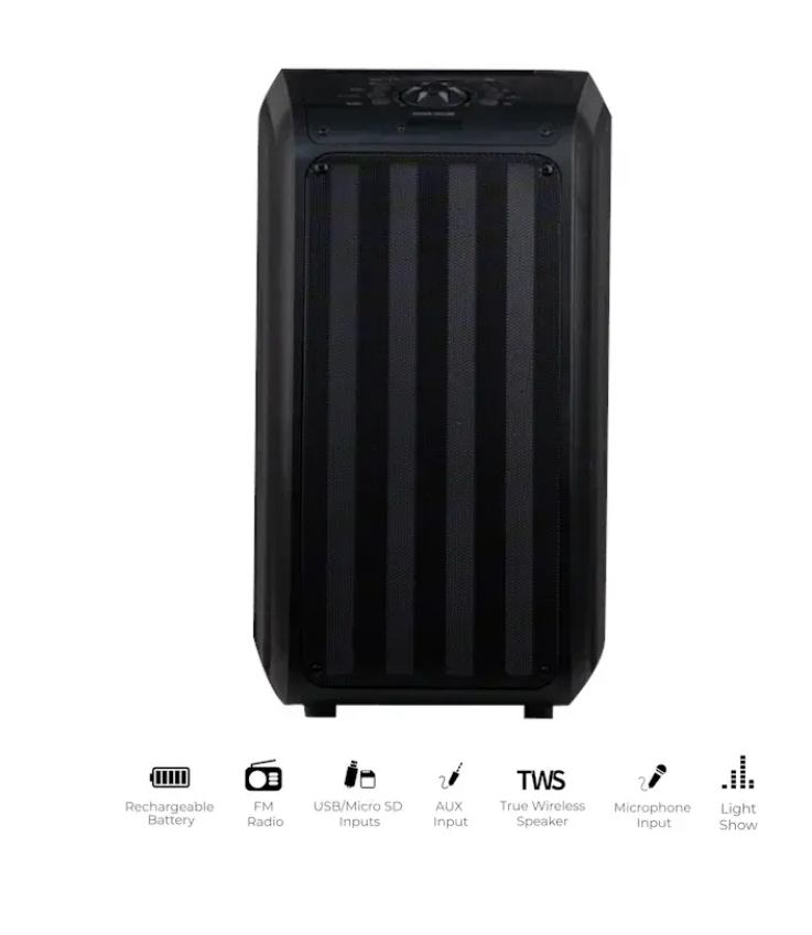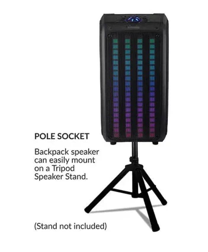Features and Specifications: 2x 6.5" Portable Backpack Speaker with Bluetooth and LED Light Panel This Speaker Delivers Durability, Flexibility, and Outstanding Audio Performance The Speaker System is Perfect for Home Entertainment, Seminars, or Any Other Venues and Events Built-in Bluetooth 5.0 Compatible True Wireless Stereo (TWS): Connect 2 Speakers Via Bluetooth with TWS Technology So they Can Play at the Same Time and You Can Double Your Audio Output Light show, colorful LED lights dance and change to the beat of music USB, Micro SD & AUX Inputs Allow You to Connect Your Non-Bluetooth External Audio Devices FM Radio 1 Mic Input (wired mic included) Remote Control System Type: 6.5" Woofer x 2 Frequency Response: 60Hz-13KHz Impedance: 2.5 Ohms S/N Ratio: 79dB RMS Power: 20W Adjustable and Removeable Shoulder Straps Built-In Rechargeable Battery: 4500mAh Play Time: Approx. 4-6Hrs Charging Time: Approx. 3-4Hrs Accessories: Remote Control, Wired Microphone, and Manual Dimensions & Weight: Unit Dimensions (in): 10.24 x 4.46 x 17.84 Unit Weight (lbs): 8.07 Gift Box Dimensions (in): 11.73 x 9.96 x 20.2 Gift Box Weight (lbs): 9.17 UPC: 639131282650...