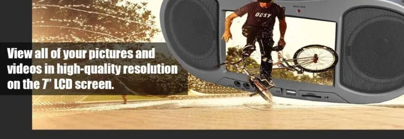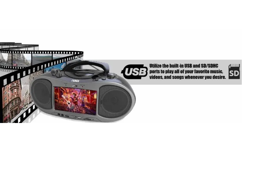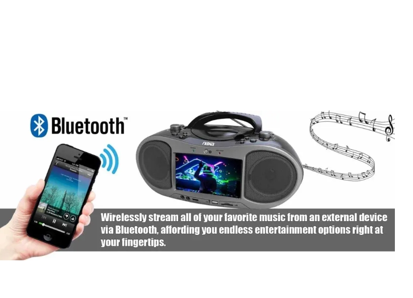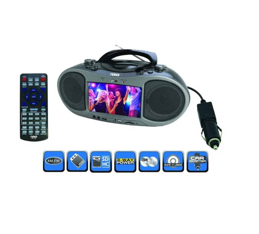 Experience unique entertainment with the 7" Bluetooth(R) DVD Boombox (NDL-256) from Naxa. The NDL-256 gives you remarkable versatility in use as a device that is both compact and portable. Featuring an innovative TFT/LCD display, ATSC tuner, and Bluetooth DVD player that lets you watch your favorite television shows wherever you go. It can support a range of audio and video file formats as well as card readers, allowing you to play a variety of digital media from SD cards, memory sticks, CDs, MP3, AM/FM radio, or DVDs. The twin speakers with full-range drivers give this boombox the kick to fill any room with resonating sound in crystal-clear quality.