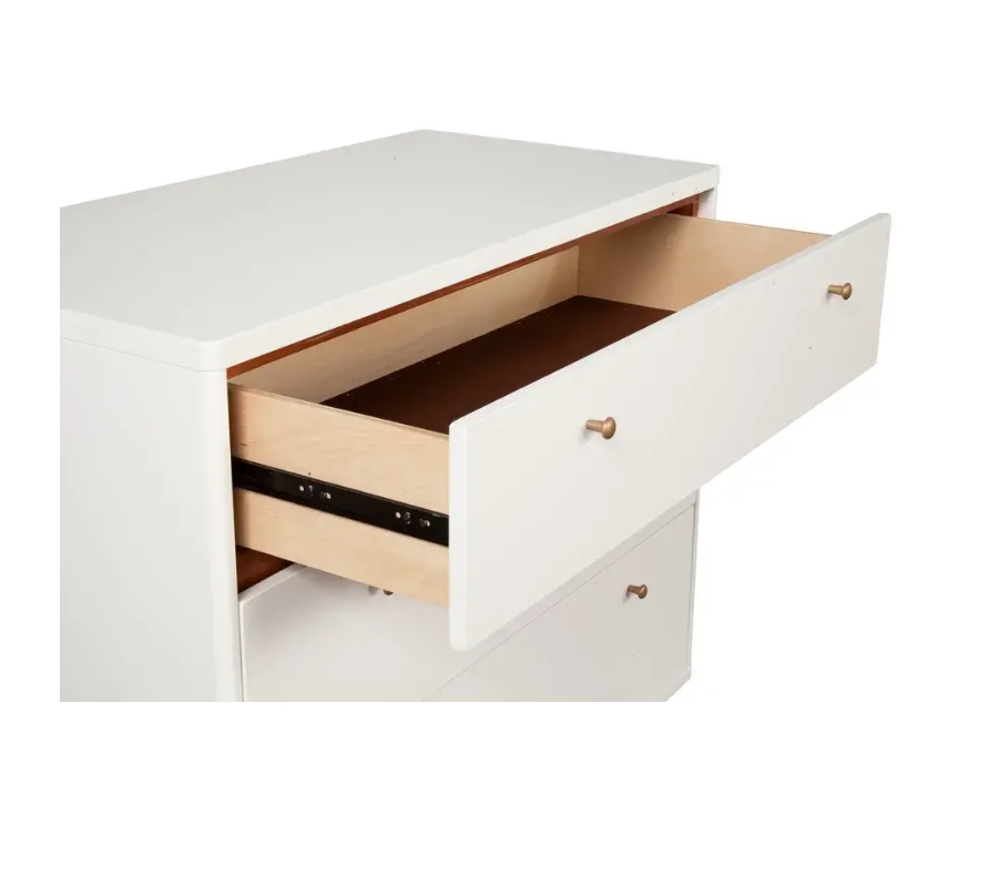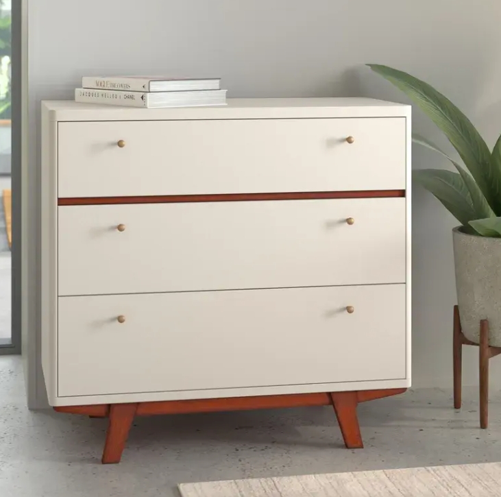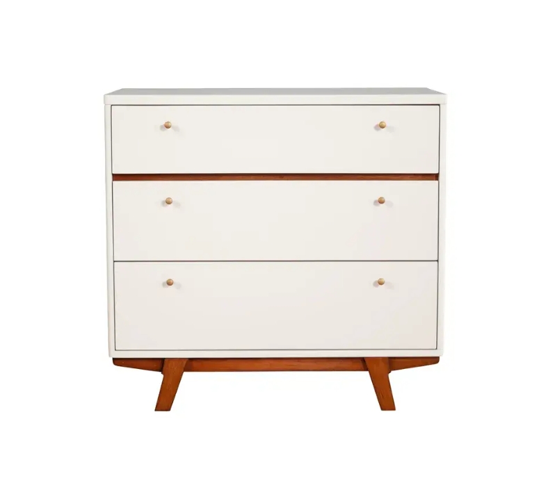Give your bedroom a stylish and modern, mid-century feel with this clean lined collection. The Dakota 3 drawer small chest is structurally sound and constructed with Mahogany wood solids & veneer in a white finish and trendy acorn brown accents. The Dakota collection hints at subtle refinement, without overpowering your current decor. Drawers feature English Dovetail Drawer Construction, felt lined top drawer to protect your valuables as well as metal ball bearing drawer glides The pieces in the Alpine Furniture Dakota collection fluidly fits in with a variety of aesthetics and color schemes to compliment your bedroom setting. Coordinate with other pieces from the Dakota bedroom collection.