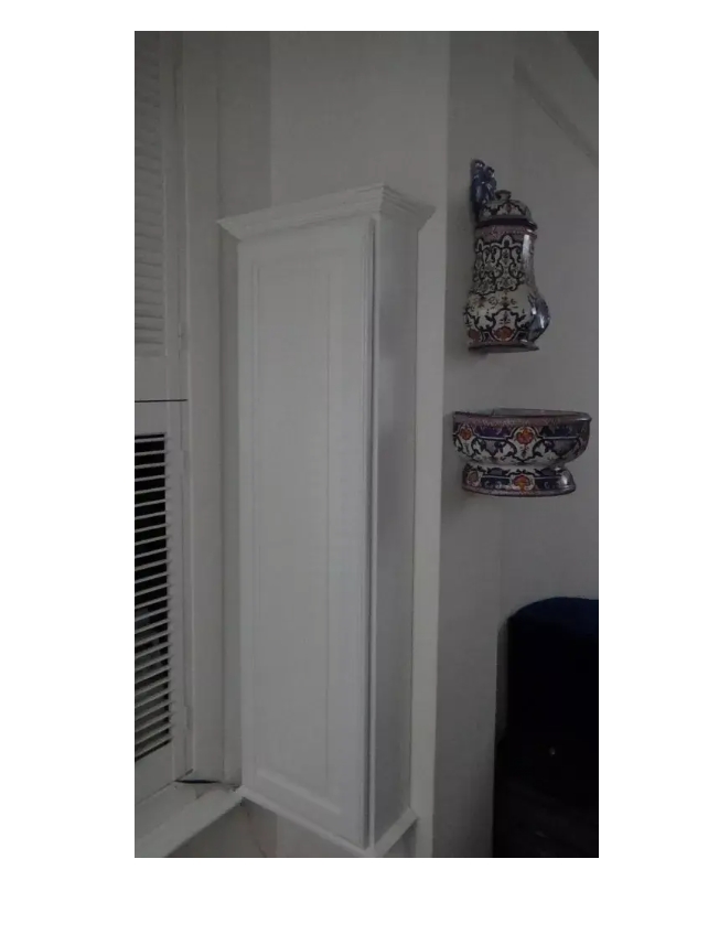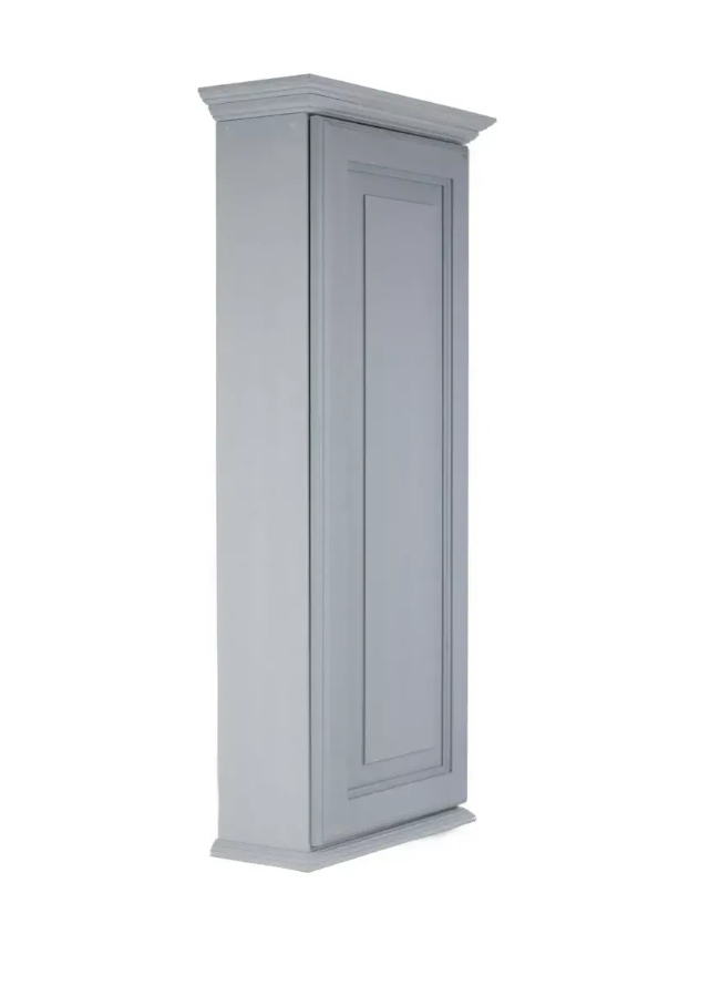 Mounts on the wall with steel mounting brackets inside for an easy installation. With two mounting methods, there is no need to worry about where the studs are in the wall. Five fully adjustable glass shelves slide into our patented shelf supports so they don't tip or rock. The raised panel door sits on concealed hinges with soft close feature, door is reversible so you can mount it to open either direction. Perfect as a medicin-e cabinet, spice cabinet, or storage cabinet anywhere. OVERALL Measurements are 49.5h x 15.5w x 5.25"d OVERALL. You'll have nearly 4.5" of depth INSIDE the cabinet. Unfinished bare wood can be painted or stained as desired. Solid pine cabinet box with solid maple door. Proudly made in Sarasota, FL.