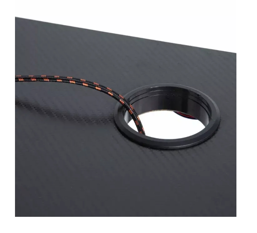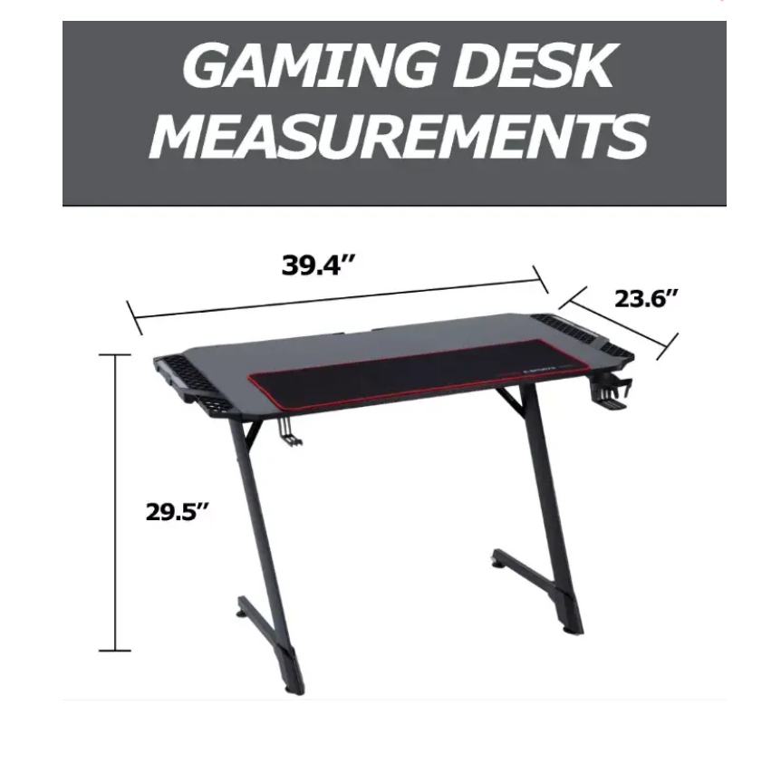 The Aggro Z-shaped gaming computer desk is designed to elevate your game and maximize your success. Providing a large, ergonomic surface, the Aggro gaming desk is perfect for gamers who like to spread out in the heat of battle. Its solid build features steel tube, z-shaped framing and a carbon fiber laminated desktop that can support multiple monitor setups, keyboards, mice, and any other accessories needed for epic gaming. The Aggro also features a discreet cable management system for hanging cables and comes equipped with a headphone hook, cup holder, gamepad holder with built-in USB charging ports, and a desktop mat. Illuminate your gaming experience with the attachable RGB LED extension stands and control your gaming ambiance using the built-in buttons on the extension stands.