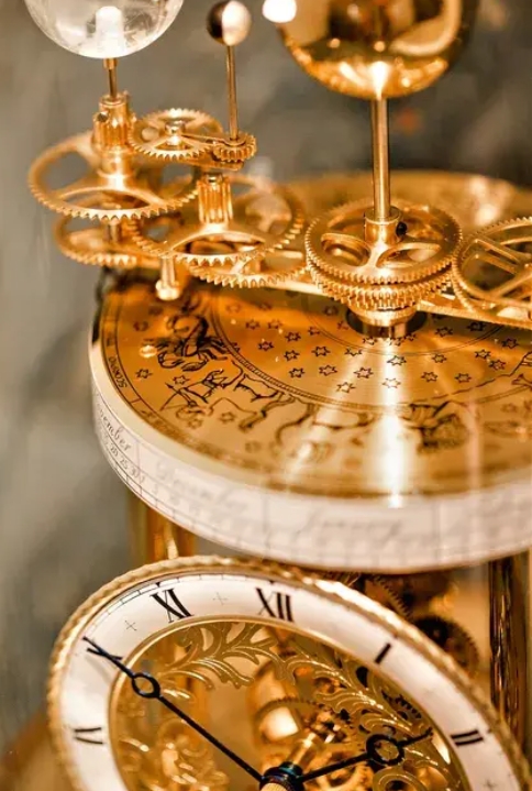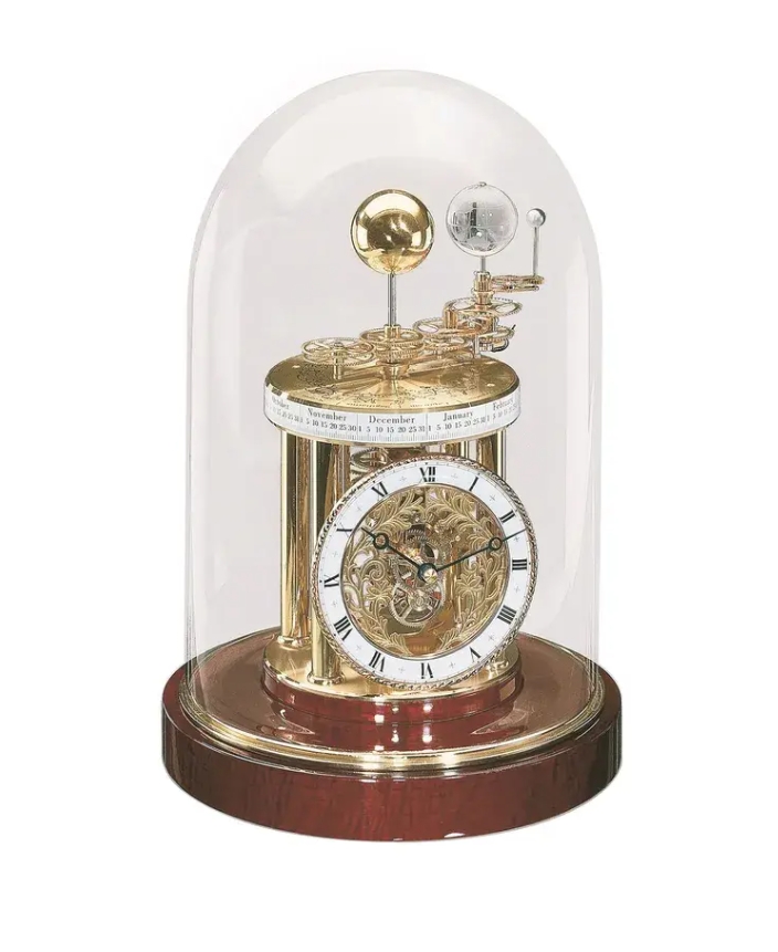 The highly accurate quartz regulated Astrolabium features a calendar and zodiac disc and individual representations of the sun, moon and Earth. Through the visible highly intricate gear train system, the Astrolabium clock reproduces the annual orbit of the earth around the sun, with the earth rotating around its own axis once in 24 hours and the moon revolves around the earth in 29.5 days, completing a full rotation around its axis. In the course of one year, the earth passes all twelve zodiac signs, months and individual days, which are indicated on the nickel plated disc.