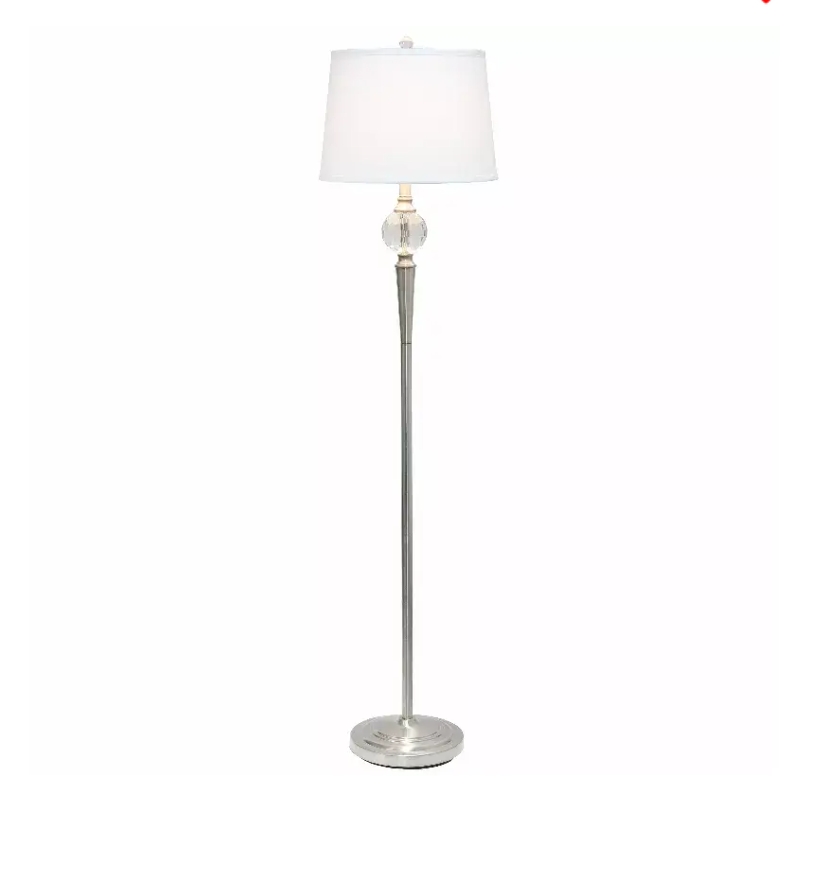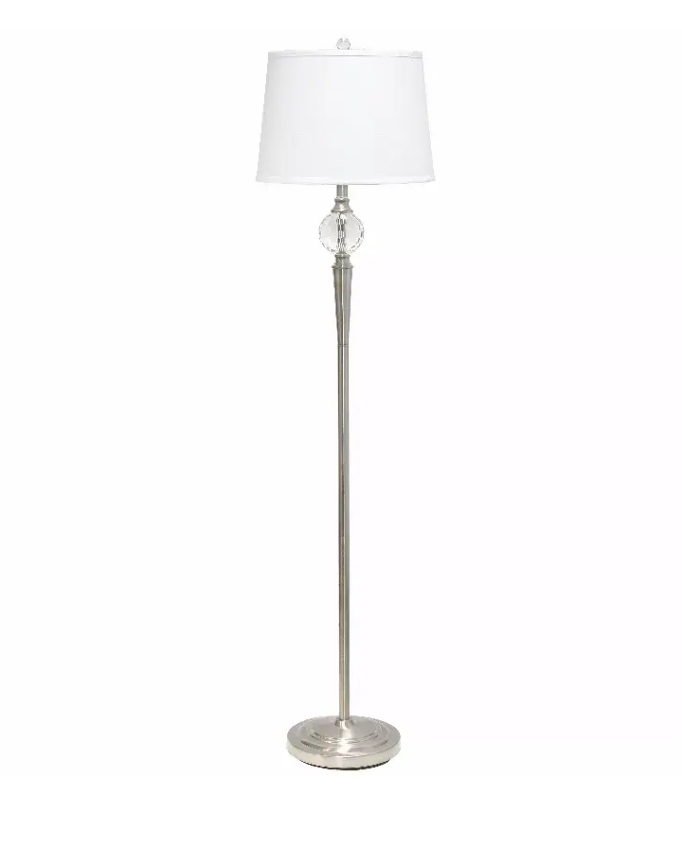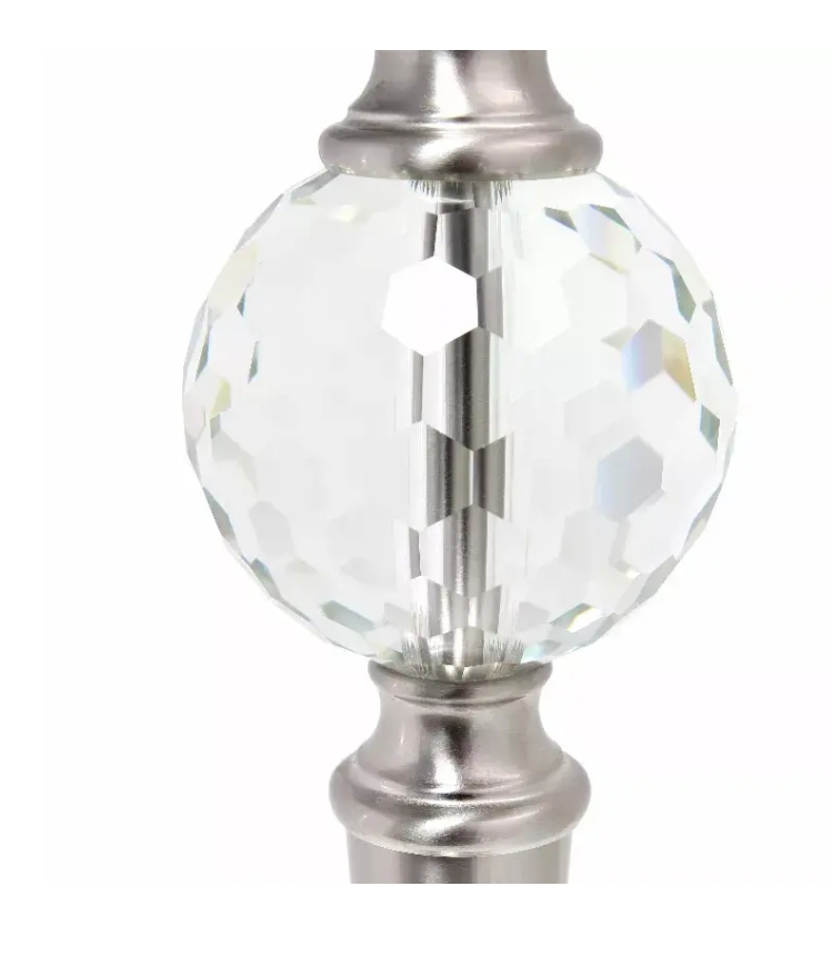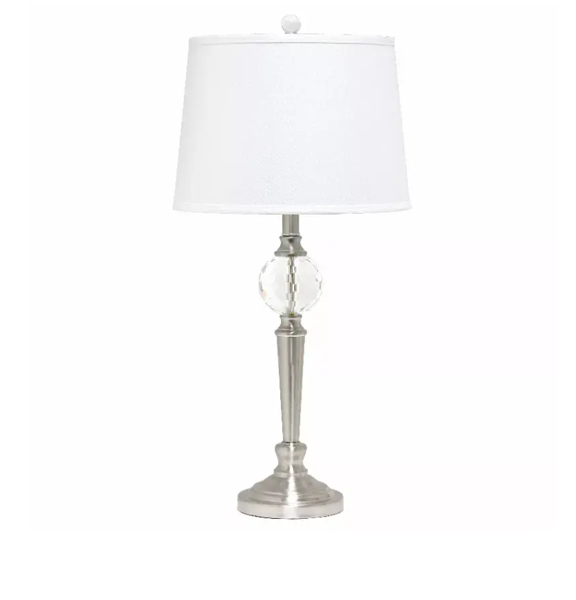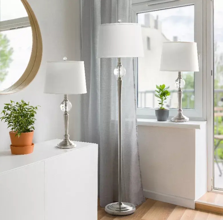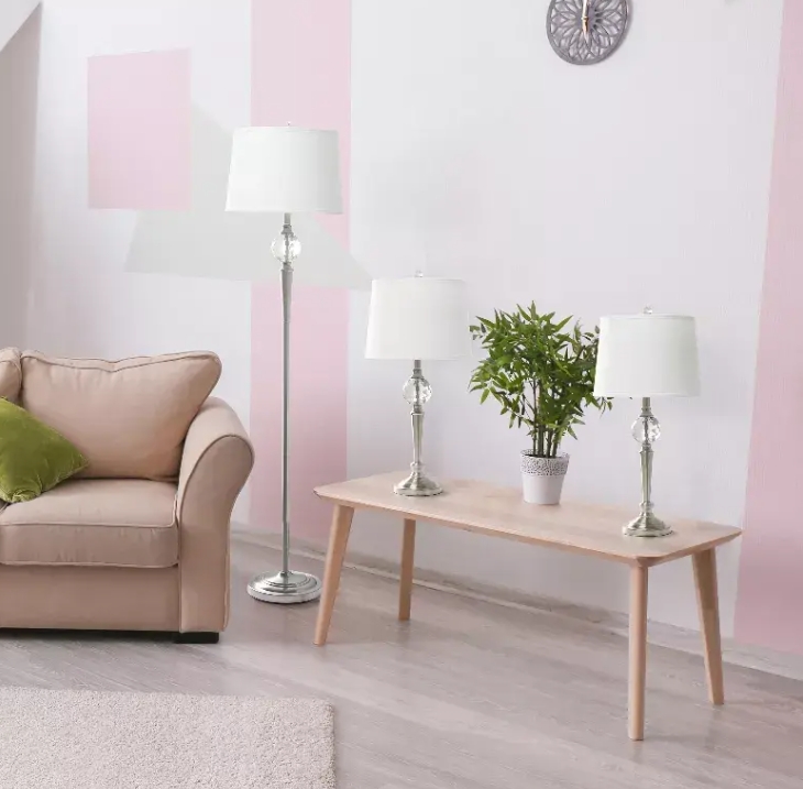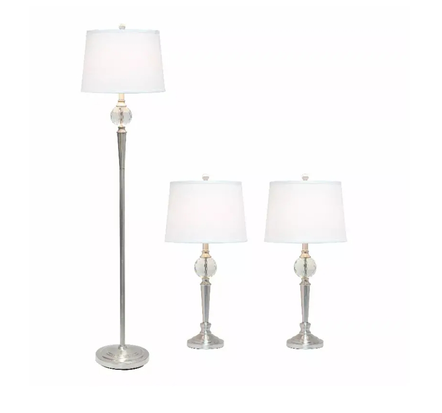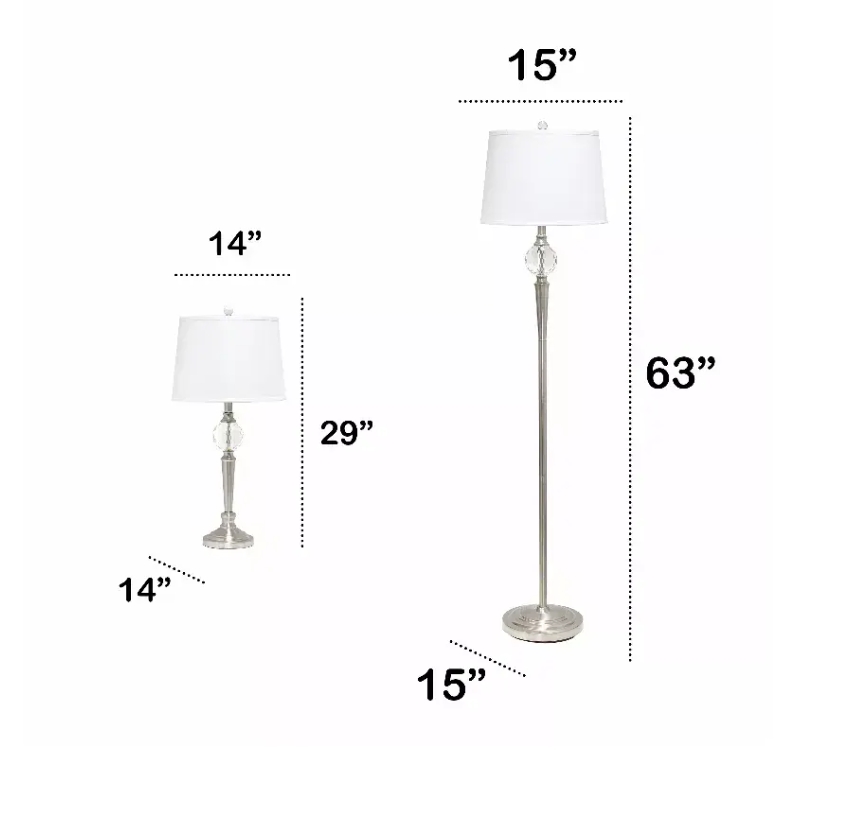 This luminous 3 piece lamp set consists of two table lamps and an identical floor lamp. Finished in brushed nickel throughout its base, a prism like crystal is featured at the top just below the white empire shades included. Designed to compliment a simple yet sophisticated interior design, you can't go wrong with this purchase!