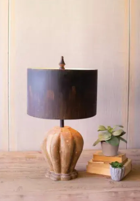 Table Lamp With Natural Wooden Base & Dark Metal Barrel Shade 16"D X 24.5"T