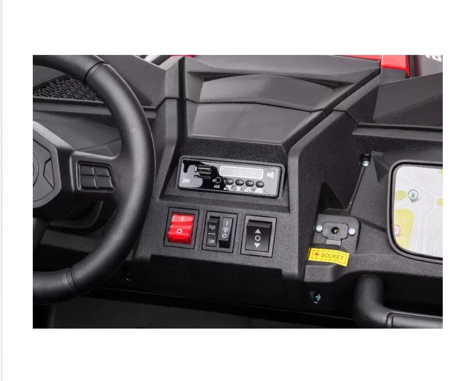 Length: 53.15 Width: 37.40 Height: 31.50 This model is the star of the desert without any doubt! Its 24V battery is capable of supporting two children up to 132lbs and it can move on any type of terrain without any problem thanks to its EVA tires and suspensions. It also has seat belts and a remote control for the parents so they can be at ease at all times, and also has two seats. Your child will be able to share great adventures with his best travel companion while listening to his favorite music thanks to the mp3 player. The driving experience has never been so much fun!