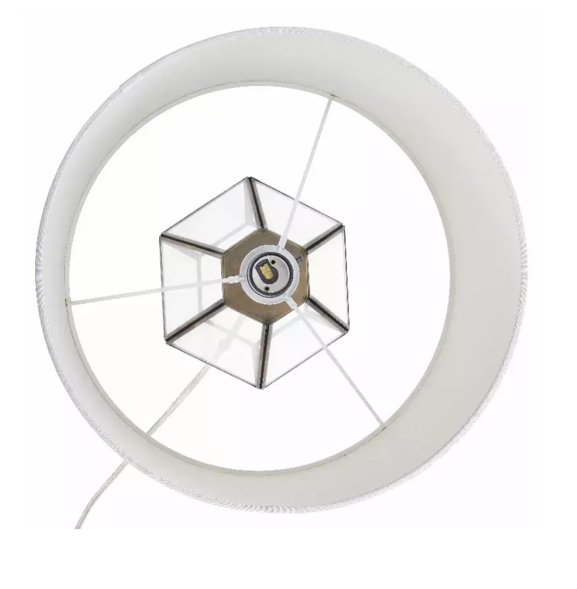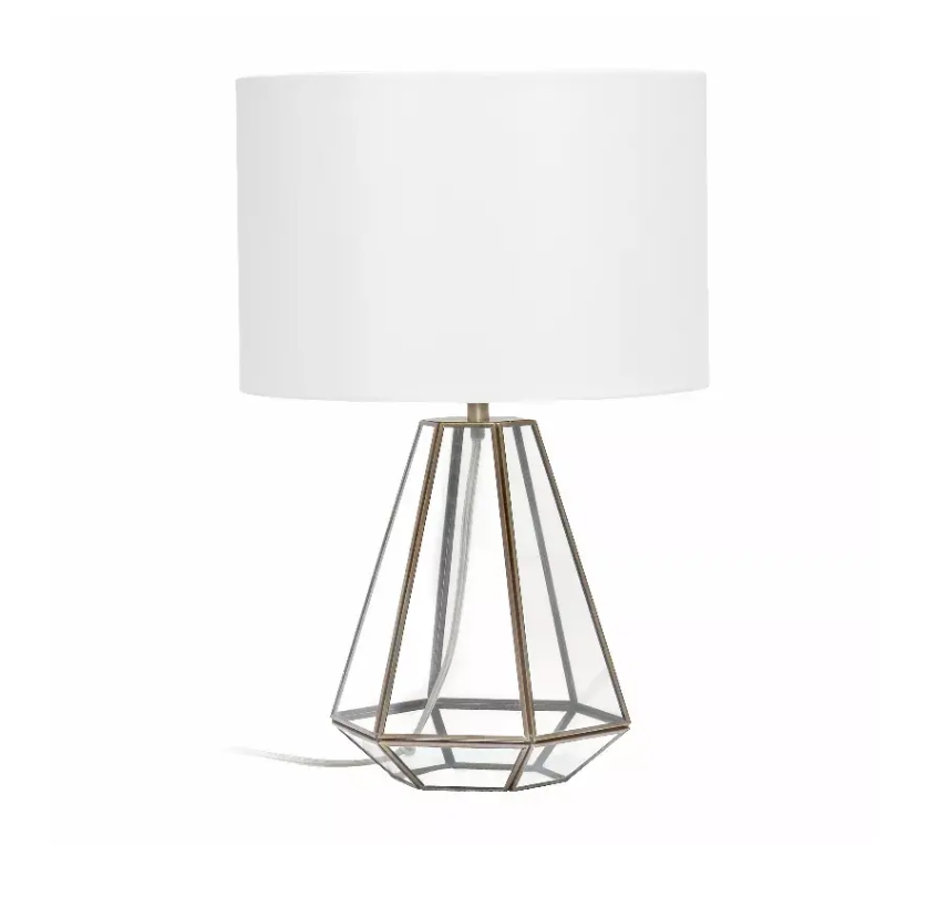 A stunning piece of d?cor suited to properly light your space is the key to designing this gorgeous triangular shaped table lamp. A transparent glass base with brass metal accents is paired with a white drum shade to inspire a vintage feel with modern class. The glamour and elegant style of this lamp powers on with a push pin on/off switch making it convenient to place bedside, atop your living room accent table, your foyer entrance, or office space!
