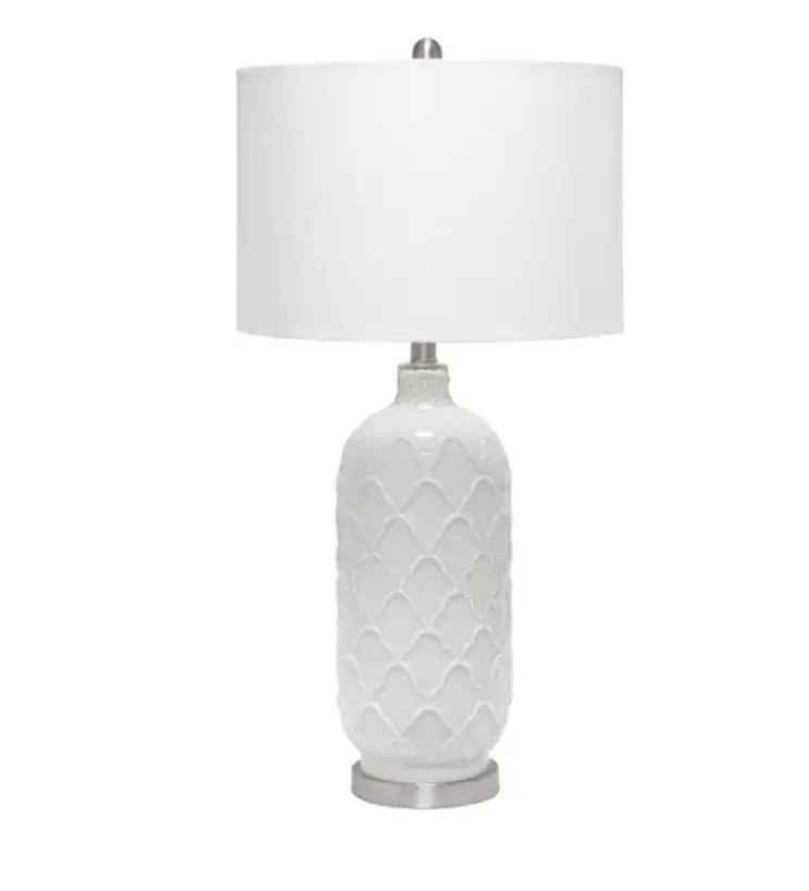 This simple yet sophisticated lamp stands tall at 29.25" and is sure to make a statement in any room in your home. The crisp white glass is delicately designed with a charming pattern and complimented with brushed nickel accents and a fresh white fabric drum shade. Perfect for large foyers, bedrooms, living rooms or offices!
