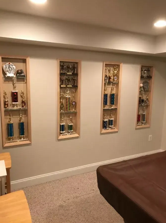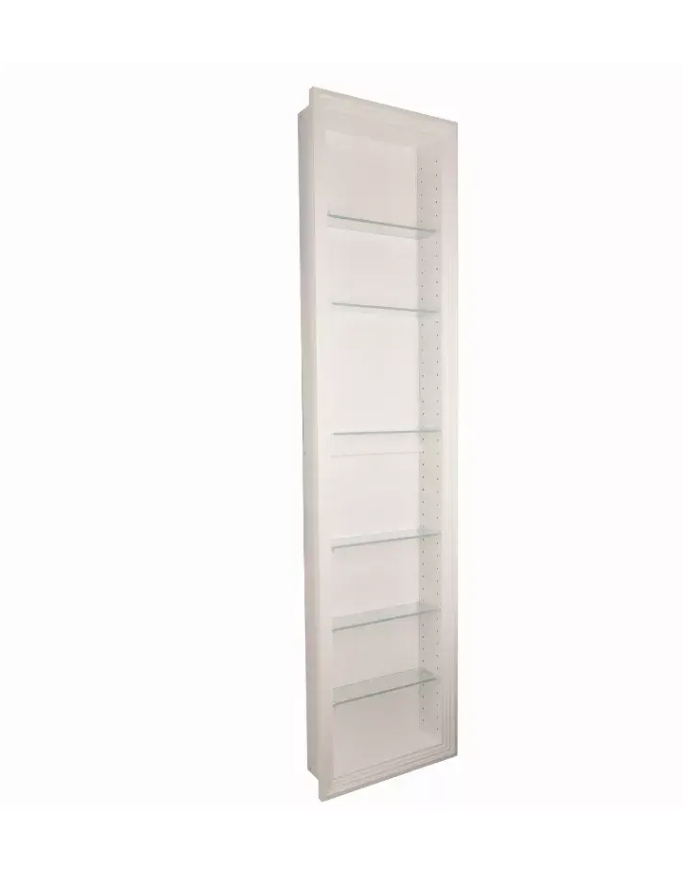 Handcrafted by artisans right here in Sarasota, FL. Recesses in the wall between studs! Easy installation. Simply put construction adhesive (not included) on the back side of the frame and push it into the opening in your drywall. It will glue to the outside surface of your drywall. Or you can screw it to the studs on each side. Seven fully adjustable glass shelves use our own patented shelf supports. The shelves slide in, then install the included shelf retainers, and the shelves cannot fall off or come out unless you want to move them! Perfect in an earthquake zone. Measures 67.5h x 15.5w x 3.5d. Unfinished Bare Pine can be painted or stained. Requires an opening in your wall of 14 1/8w x 66 1/8h.
