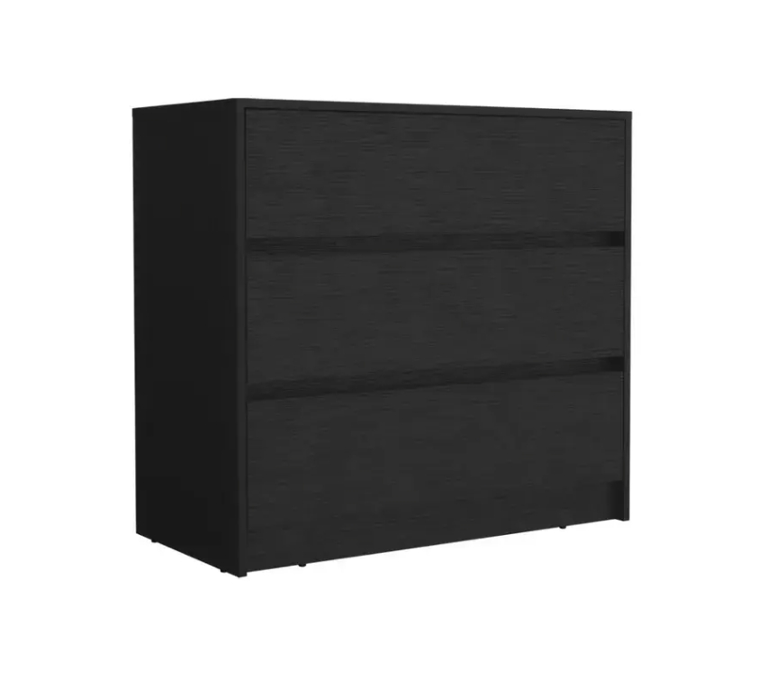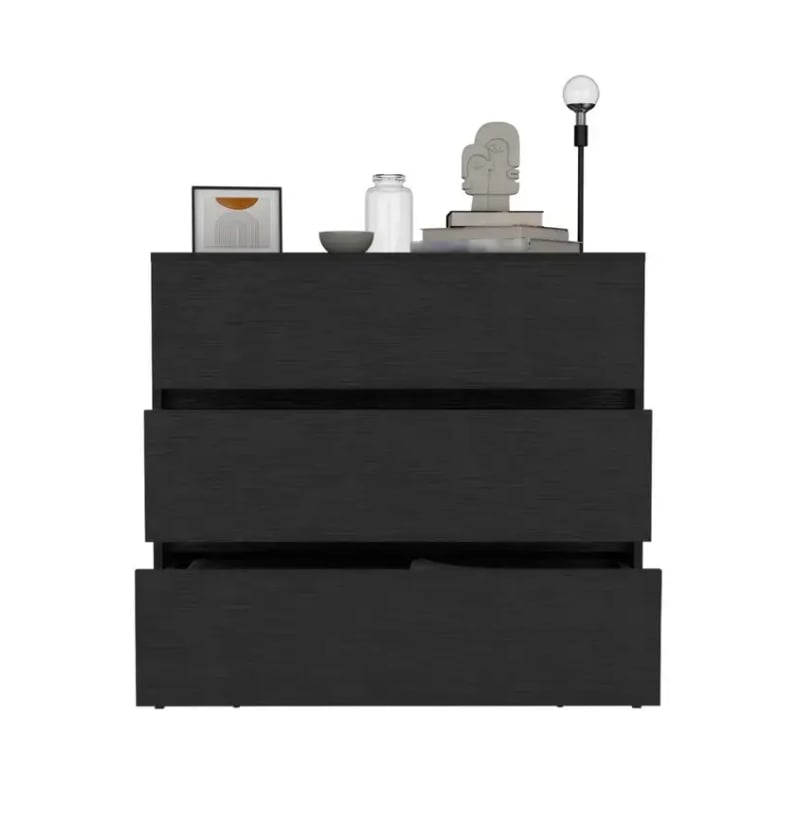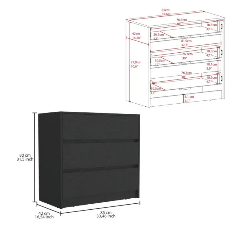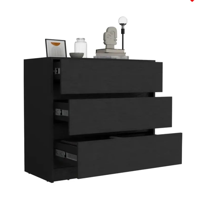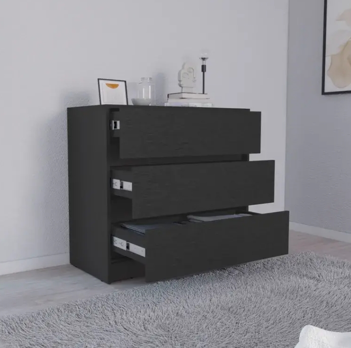 Looking for an ideal solution for storage in your home? Look no further than this Austin Three Drawer Dresser. With a modern look and three spacious drawers, this drawer dresser is perfect for storing all your clothes or essentials. The metal rails on the drawers make moving them easy, and the top surface is ideal for displaying your favorite decorations. Plus, the modern style makes you smile whenever you use this dresser. Designed with an elegant black manufactured wood finish. Dimensions: Height: 31,5" Width: 33,46" Depth: 16,54" Furniture Type: Ready to assemble (full assembly required). Certifications: CARB phase II compliant - TSCA Title VI Compliant. Warranty: 1-year warranty coverage in wooden parts- 1-year warranty coverage in hardware pieces since its manufacturing date found in the lot number printed in the product box.