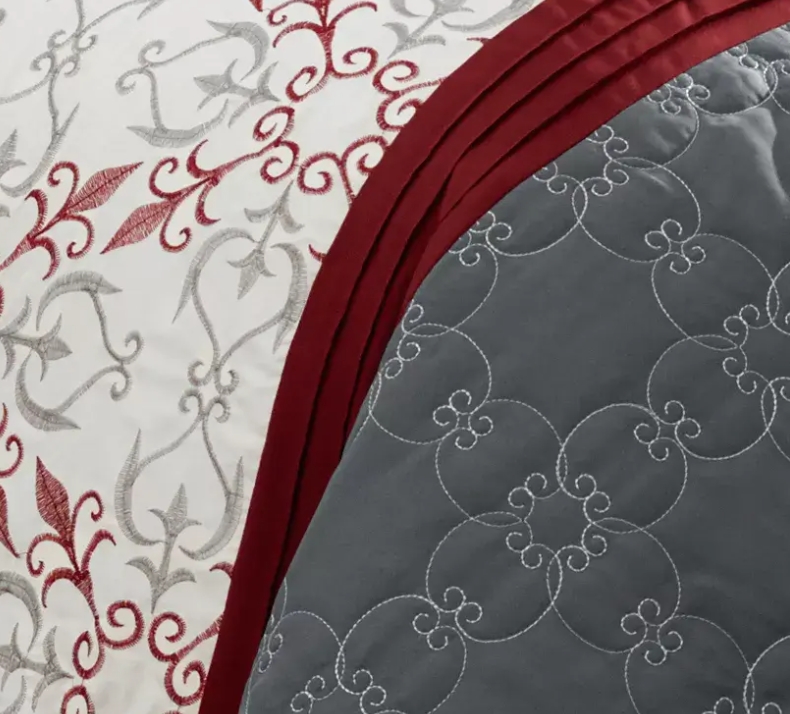 This Comforter Set is made from quilted horizontal stripes with multi solid coloured bands and a floral embroidered design. Coming with 6 additional pieces, this set brings a touch of class to any room. Set includes 1 comforter, 1 dust ruffle, 2 pillow shams and 3 decorative pillows. Transitional to fit any home's style. 106x92 in color Red.