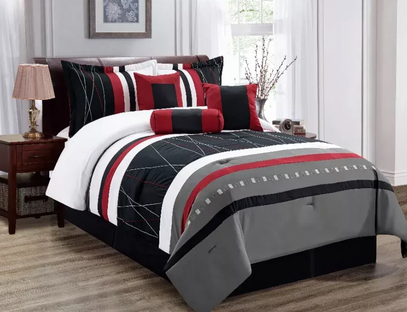 If you are looking to update your bedroom space, the place to start is with its primary asset, the bed! This 7 Piece Comforter Set is a modern collection with a striking quality. Each piece is intricately stitched with an abstract, design. This collection's intriguing design, with vibrant colors and sharp lines, combine for a simple yet bold style. This set includes one cozy comforter, two pillow shams, Bed Ruffle and 3 Decorative Pillows, offering an easy and effective way to update your personal quarters. 100% Polyester microfiber. 106x92"