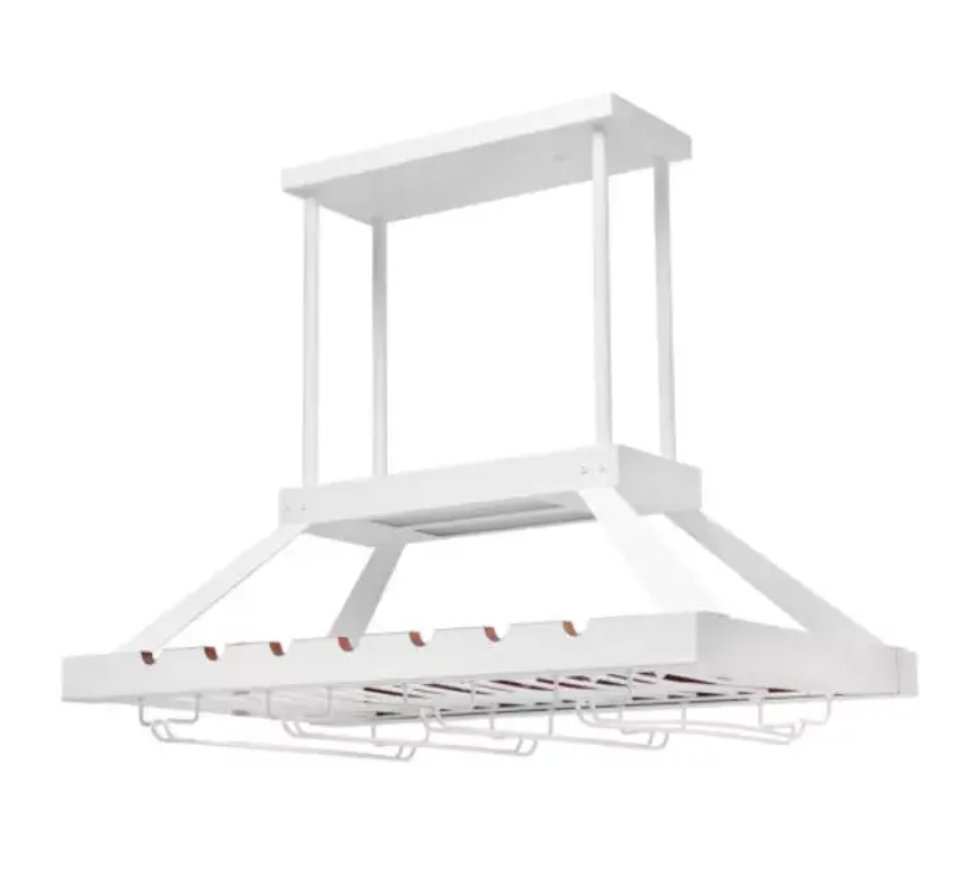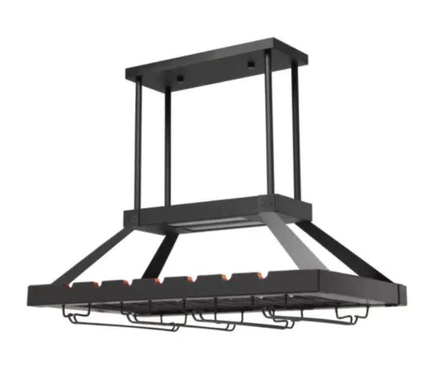 Instead of displaying your variety of wine selections the old fashioned way, why not make the upgrade to this beautiful overhead metal wine rack? Equipped to hold a combination of 14 standard wine bottles and 16 stemmed wine glasses, it serves both a functional and style purpose for your space. This product comes with a total of 12 poles that are suited to adjust the height of the wine rack to adapt to both tall and low ceilings.
