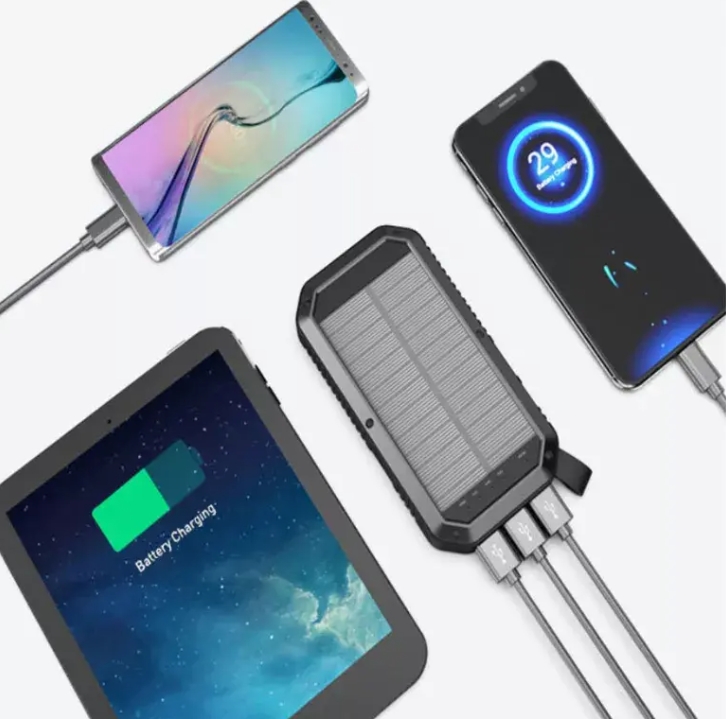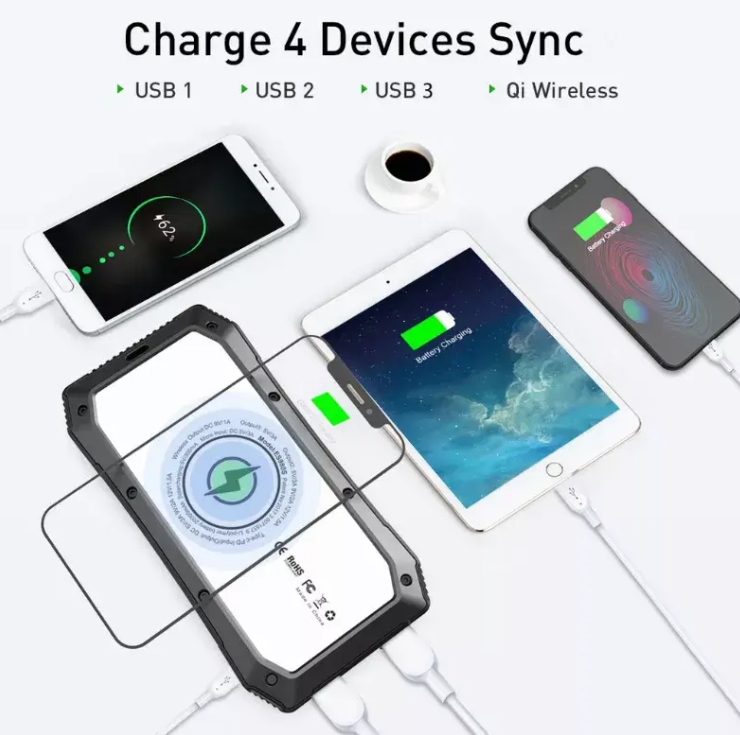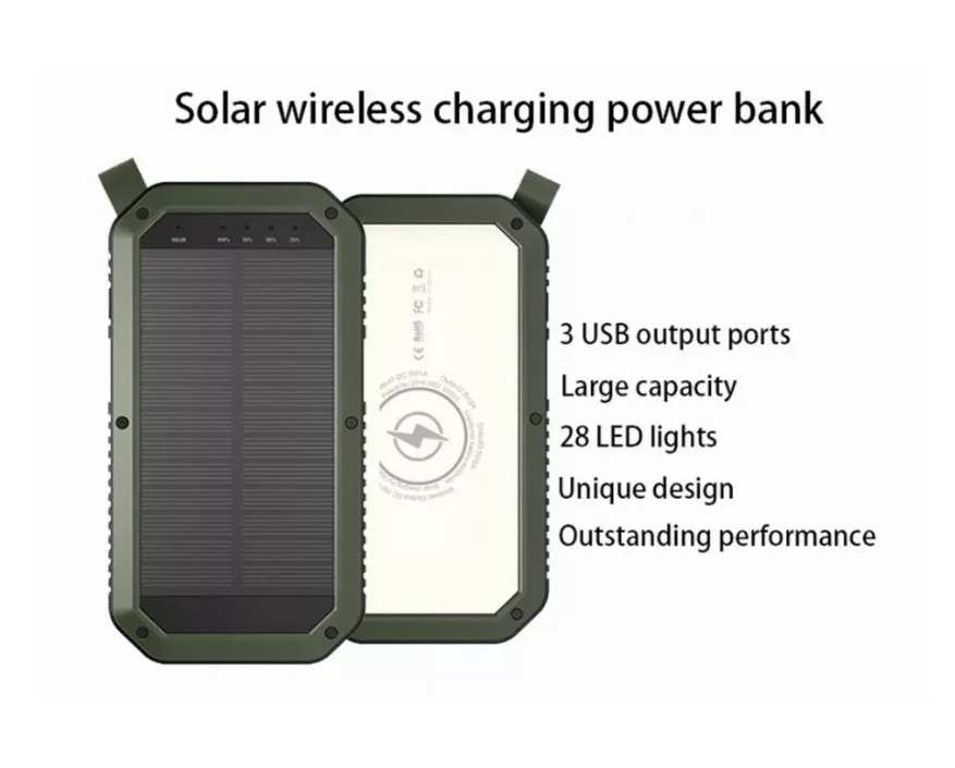 Sun Chaser Solar Powered Wireless Phone Charger With LED Flood Light. This is a 10,000 mAh capacity Solar Powerbank with a built-in wireless charger and LED floodlight. This charger with boosting charging capability can simultaneously charge 2 to 4 devices with its built-in Qi-standard wireless charger, multi-port USB ports. Charge any mobile phone 150% fully and charge any Tablet 100%. Also charge many devices like Cameras, Watches, and Toys 100%. The huge power capacity takes care of it all. The Solar panel charges your power bank and regenerates all the power again. This water-resistant power bank is perfect for indoors or outdoors and great for quickly lighting up an area 8 ft x 8ft with its LED floodlights. The built-in power regulator will not overcharge your devices. The whole power bank is shockproof and dustproof as well as water-resistant. With this is one solar charger you feel you really have power. The advanced light-absorbing solar panels take every light source and use it to convert to stored power. A true Sun Chaser- Mini, it works most efficiently in the daytime in sunlight and stores power that can be used any time anywhere outdoors or indoors. Details:Solar Powerbank 5.5 inch. 10,000 mAh stored power capacity. Qi Standard wireless charger 10W. 3 USB ports. LED Flood Light. Shock and Water Resistant hard case. .