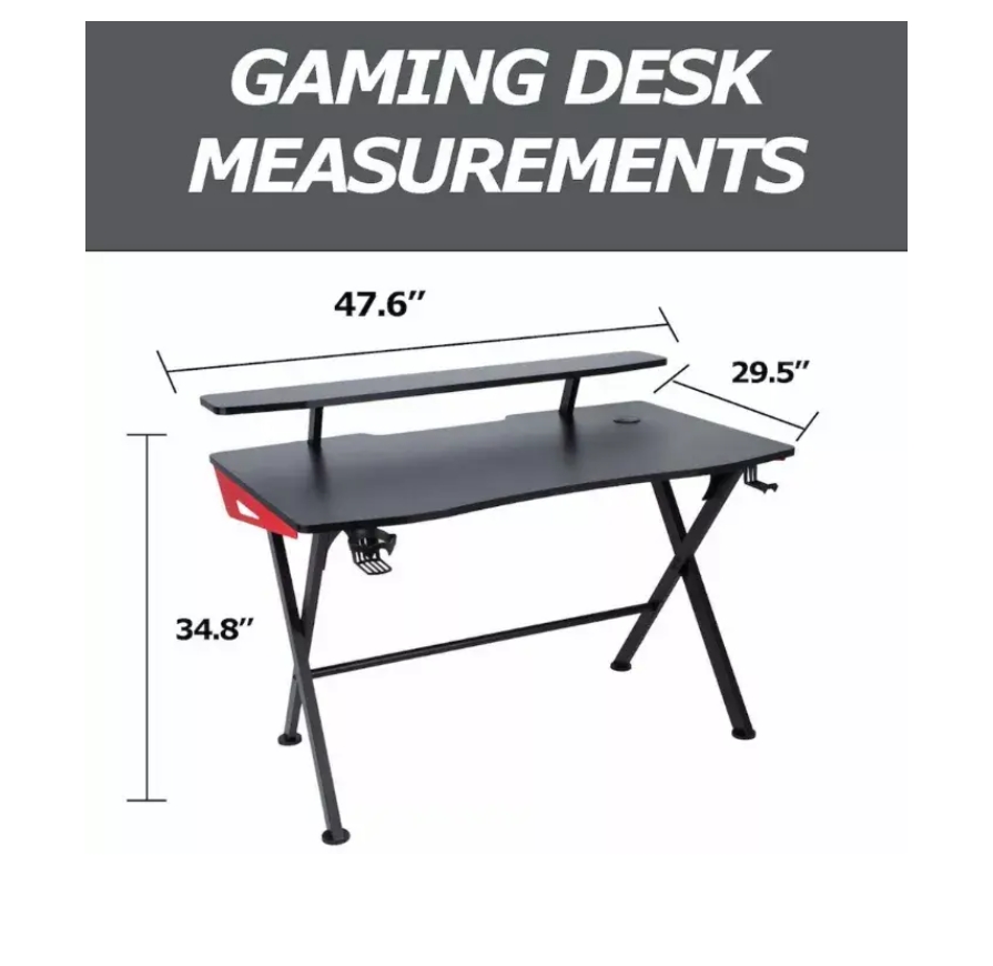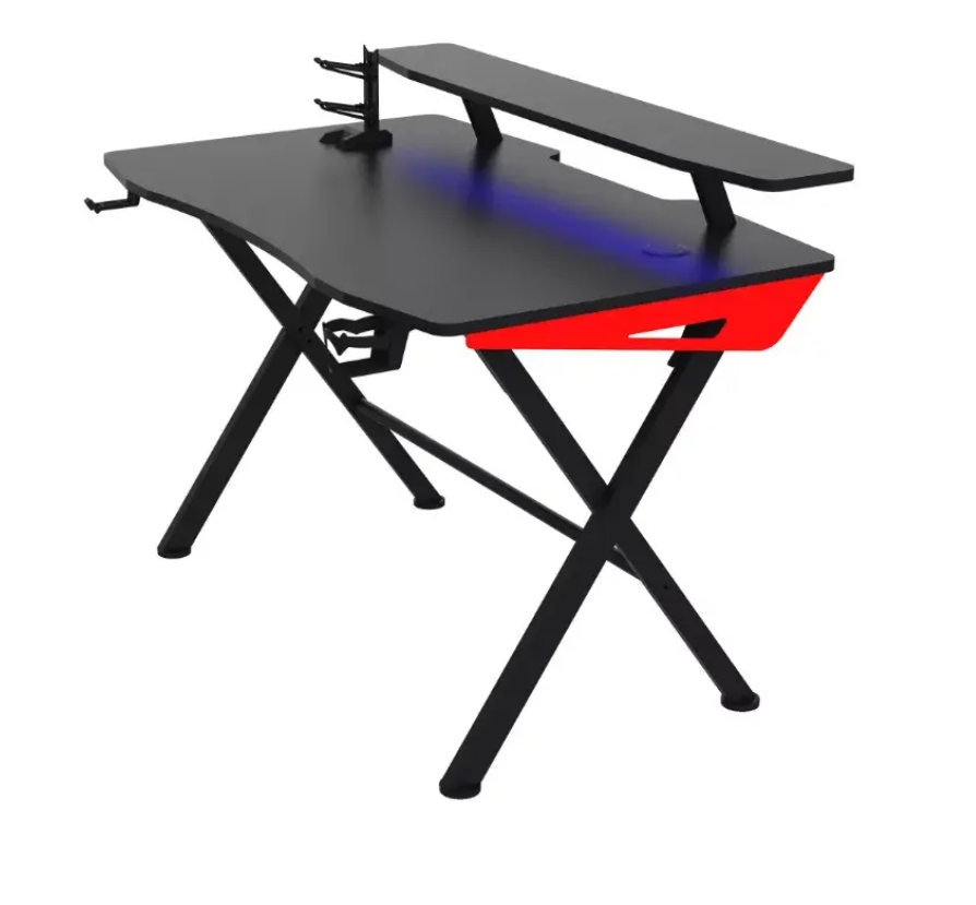 Elevate your game with the Raid Two-Tier Gaming Desk that empowers and emboldens your play. This feature-packed gaming desk will deliver hours of comfortable and fatigue-free playing. Providing a large, ergonomic surface and built-in monitor shelf, the Raid gaming desk is perfect for gamers who like to spread out in the heat of battle. Its solid build features steel tube framing and a carbon fiber laminated desktop that can support multiple monitor setups, keyboards, mice, and any other accessories needed for epic gaming. The Raid also features a discreet cable management system for hanging cables and comes equipped with a headphone hook, cup holder, gamepad holder. Illuminate your gaming experience with the built-in integrated LED lighting strip.